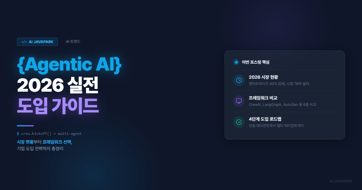 지난 포스팅에서 Agentic AI의 개념과 기존 생성형 AI와의 차이를 다뤘는데요, 이번에는 2026년 현재 시장이 어디까지 왔는지, 그리고 실전에서 어떤 프레임워크를 선택하고, 어떻게 도입해야 하는지를 정리해봤습니다.