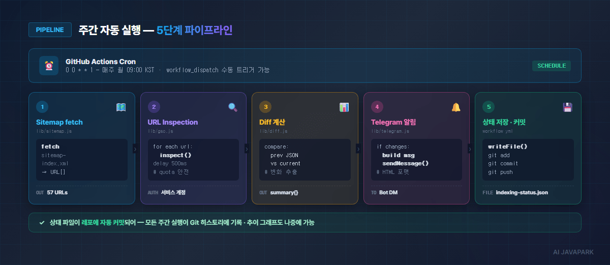 5. 새 상태를 JSON에 저장하고 자동 커밋각 단계는 독립된 모듈로 분리해서, 하나만 바꿔도 나머지에 영향 없게 설계합니다.