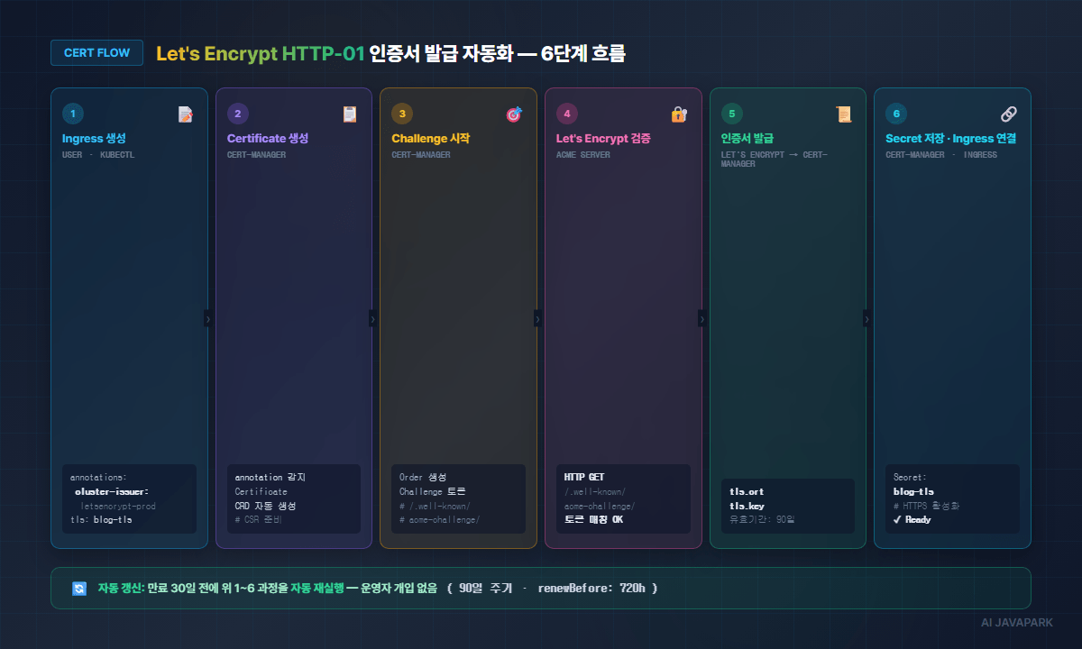 - HTTP-01은 간단, DNS-01은 와일드카드·내부망 대응