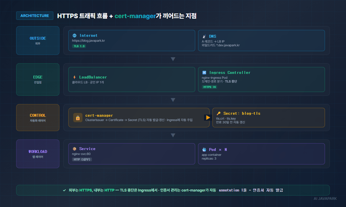 결론부터 말씀드리면 — cert-manager는 "Let's Encrypt 인증서 발급·갱신을 K8S 리소스로 자동화"하는 컨트롤러입니다. Ingress에 annotation 한 줄이면 HTTPS 인증서가 자동으로 발급되고, 만료 전에 알아서 갱신됩니다. 오늘은 Ingress 개념 복습부터 nginx-ingress 설치, cert-manager 셋업, Let's Encrypt 연동, 와일드카드 인증서까지 실전 순서대로 정리하겠습니다.