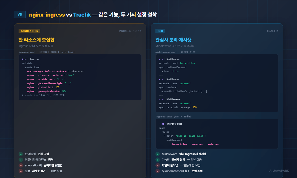 | CRD 기반 선언 | annotation으로 설정이 뒤얽히는 nginx와 달리 IngressRoute·Middleware로 깔끔히 분리 |